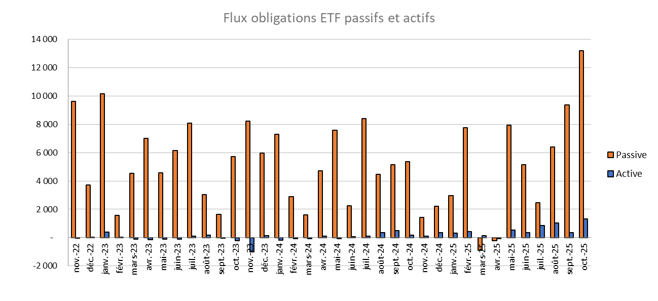 - Sur le mois, la collecte atteint environ 1,7 milliard d’euros sur les actions actives, légèrement au-dessus de la moyenne mensuelle 2025 (environ 1,2 milliard), tandis que les ETF obligataires actifs enregistrent également 1,7 milliard d’euros.