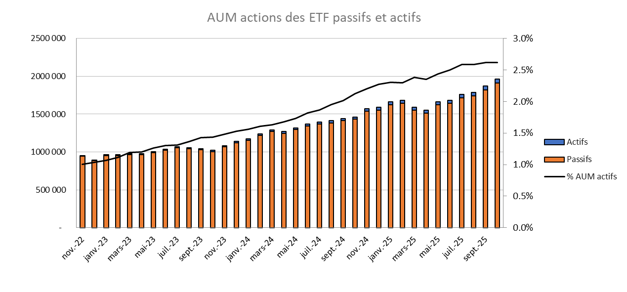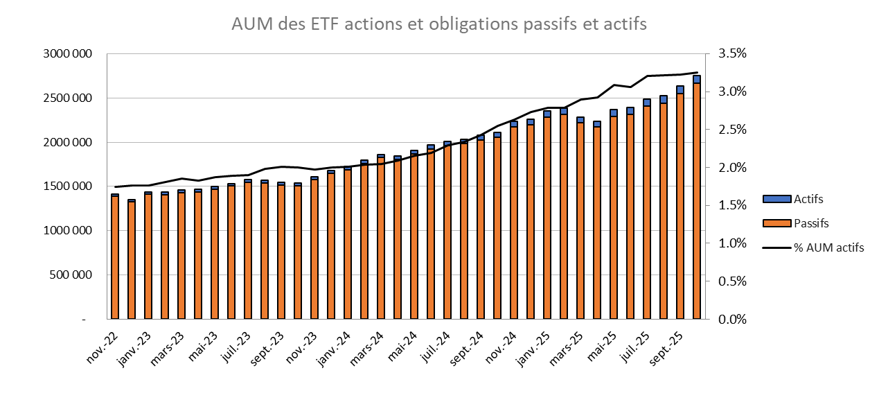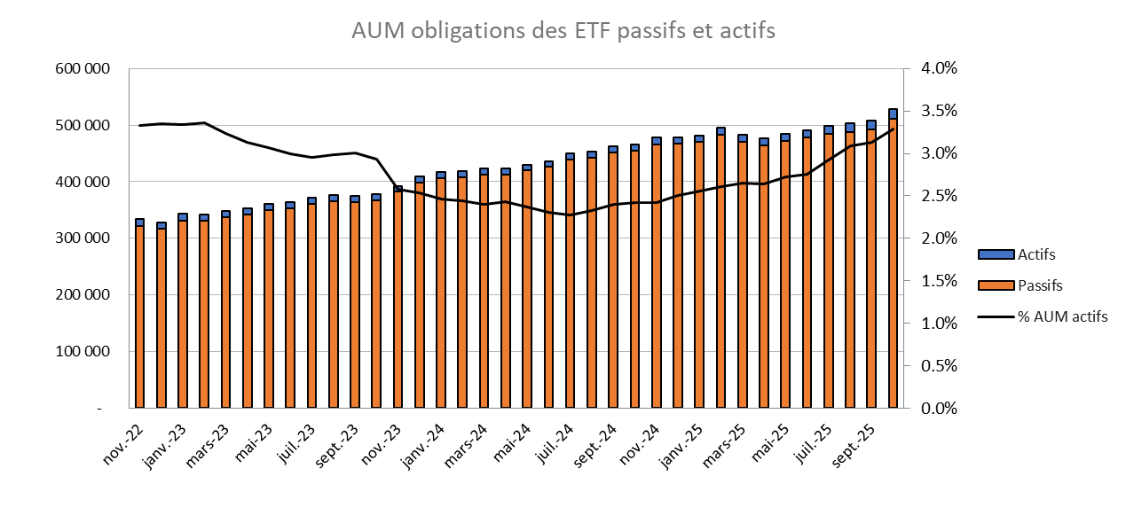 - En encours, le poids des ETF actifs demeure limité à 3,3 % du marché européen, avec 2,6 % sur les actions et 3,3 % sur les obligations.