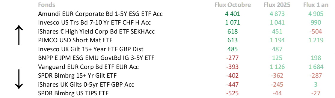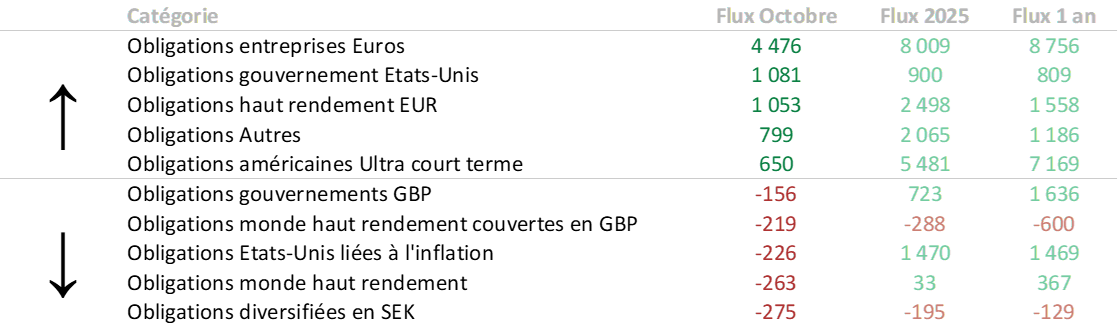 - À l’inverse, les décollectes affectent des agrégats diversifiés en SEK, le haut rendement mondial (y compris les parts couvertes en GBP), ainsi que des expositions aux obligations américaines indexées sur l’inflation et aux souverains libellés en livres sterling.