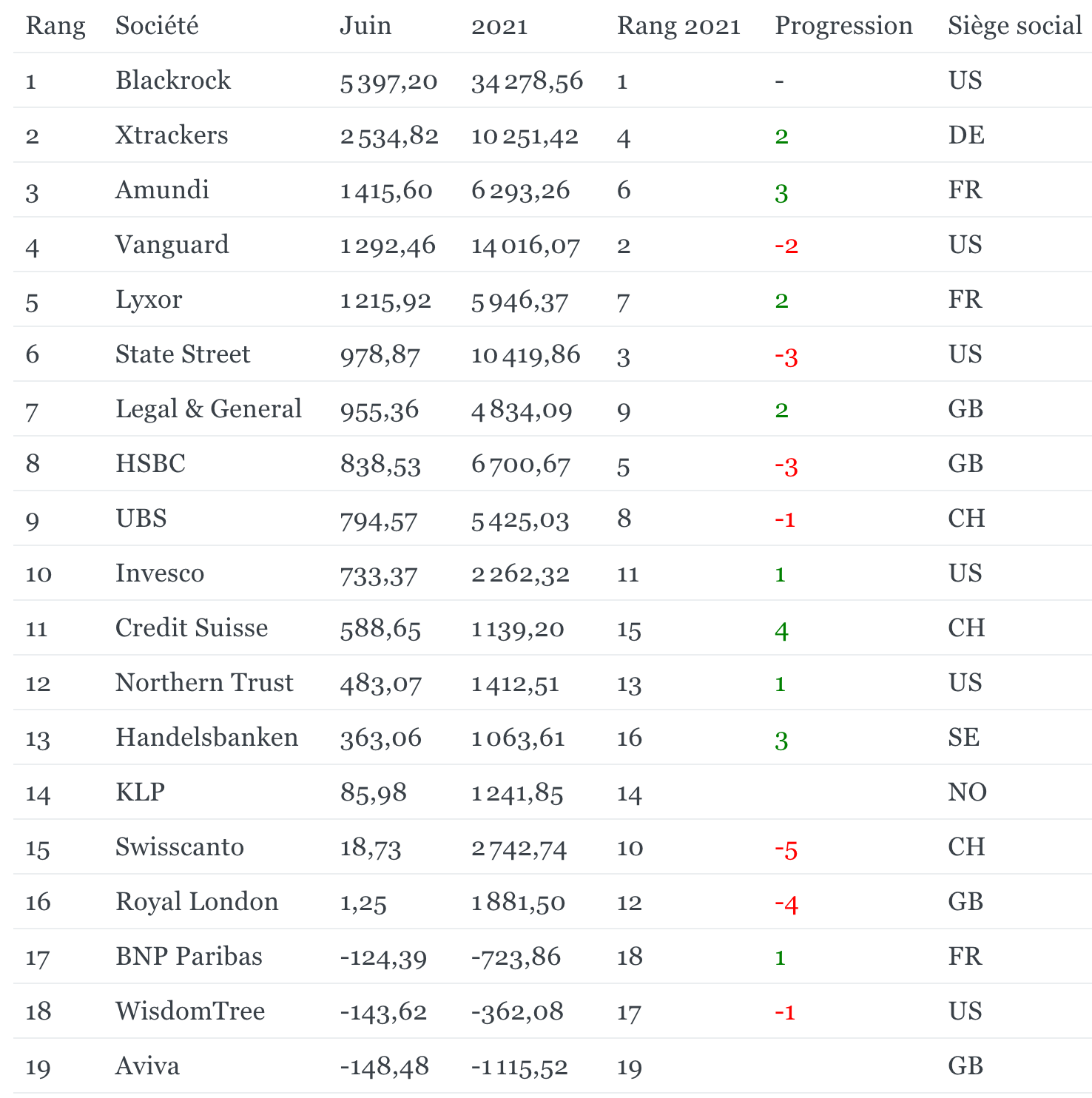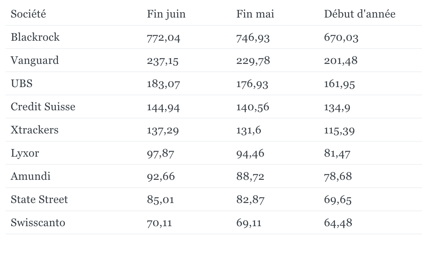 - Blackrock (comprenant iShares) reste le leader du marché européen de la gestion passive, avec près de 31 % des encours à fin juin. Quant au flux, c’est un peu moins de 30 % des capitaux européens qui se sont dirigés vers le géant américain.