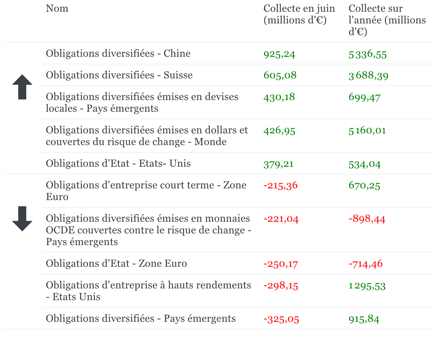 - Au sein des actions, nous constatons que le secteur financier fait partie des secteurs qui ont le plus décollecté en juin. La collecte nette depuis le début de l’année s'élève cependant à plus de 4 milliards d’euros.