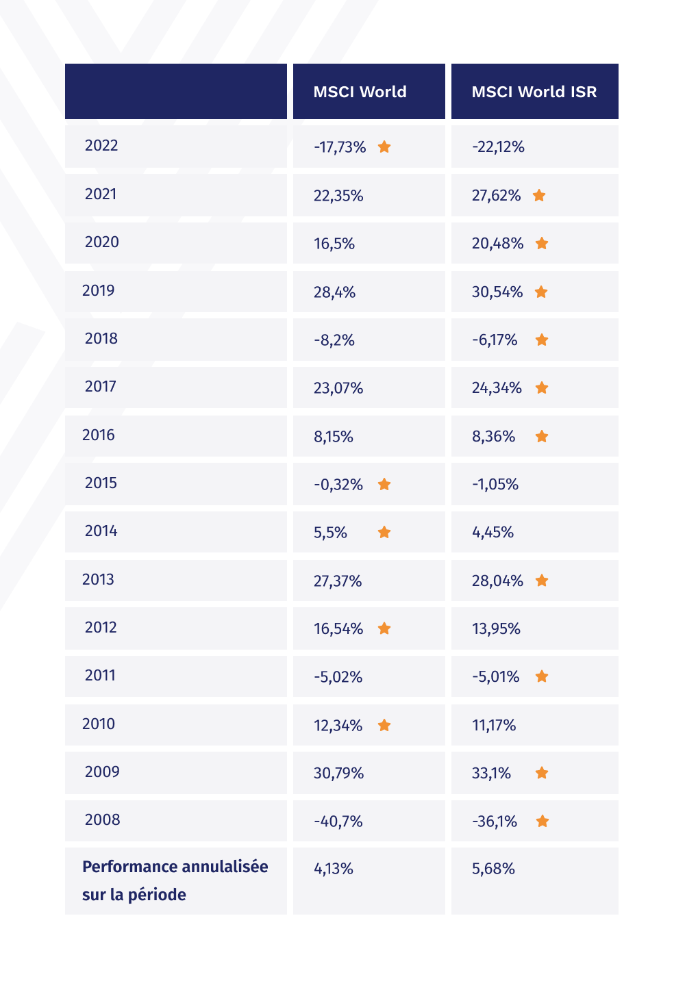En outre, sur les treize années que couvre notre analyse, l’indice ISR a surperformé l’indice classique durant neuf années.