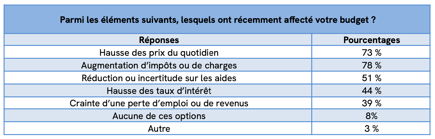 Les hausses d’impôts/charges (78 %) et des prix du quotidien (73 %) sont les deux moteurs majeurs ; l’instabilité des aides (51 %) et la hausse des taux (44 %) entretiennent le bruit de fond anxiogène.