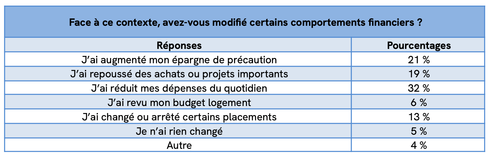 Un mouvement défensif s’installe : 32 % réduisent leurs dépenses, 21 % renforcent l’épargne de précaution et 19 % reportent des projets — des actes concrets, immédiats.