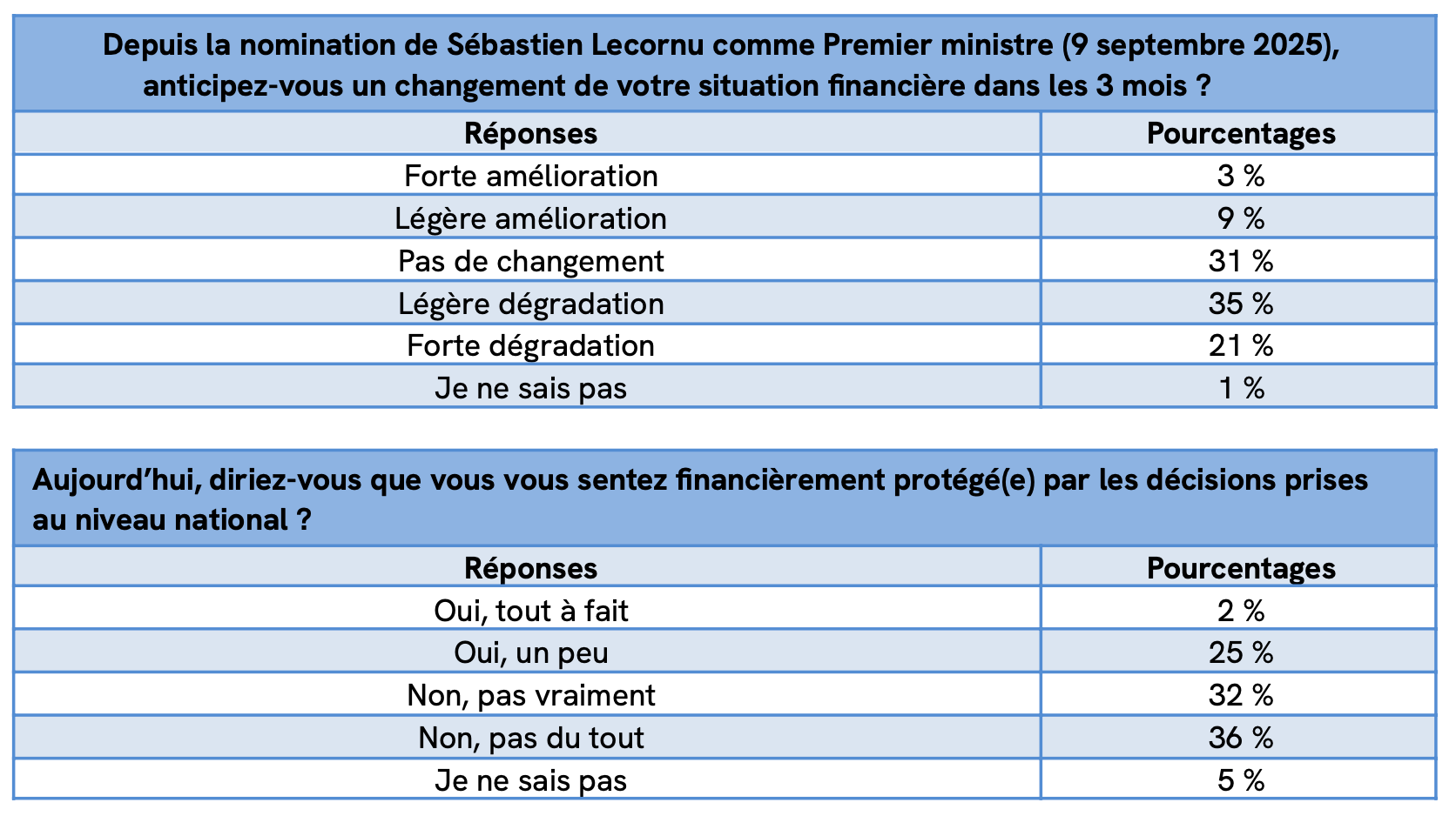 Plus d’un Français sur deux anticipe une dégradation à 3 mois (56 %). En parallèle, 68 % ne se sentent pas financièrement protégés par les décisions nationales — la responsabilité se relocalise au niveau du foyer.