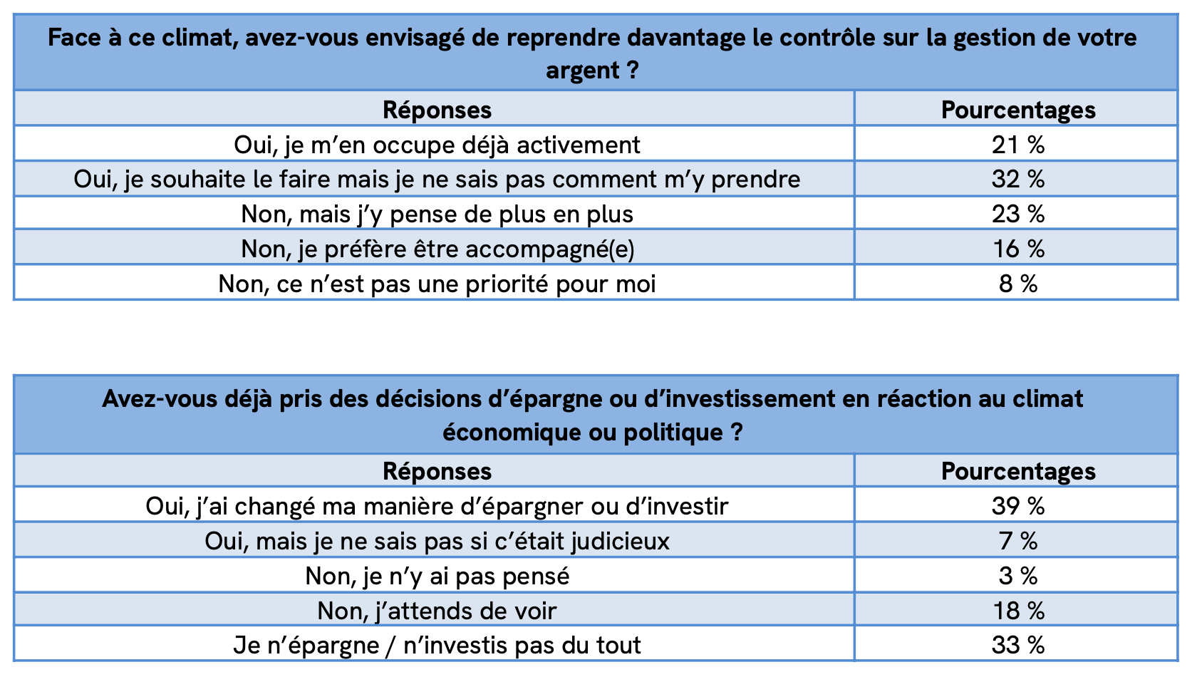 Le besoin de contrôle monte : 76 % veulent reprendre (ou pensent sérieusement à reprendre) la main sur leur argent. Et le mouvement est déjà enclenché : 39 % ont changé leur manière d’épargner ou d’investir. L’incertitude ne produit pas seulement de l’anxiété : elle déclenche des actes