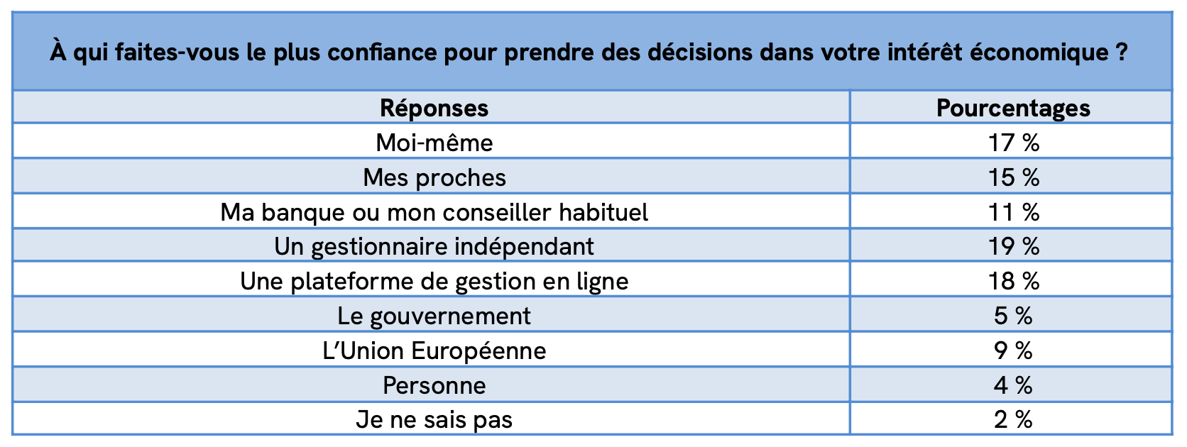 La confiance se déplace hors des canaux publics et bancaires traditionnels : indépendants (19 %), plateformes en ligne (18 %), soi-même (17 %) et proches (15 %) devancent la banque (11 %) ; le gouvernement est cité par 5 %.Côté gestes prioritaires : réduire les dépenses (19 %), reporter les projets (18 %), épargner davantage (17 %), puis se former (15 %) avant de revoir les placements (9 %).