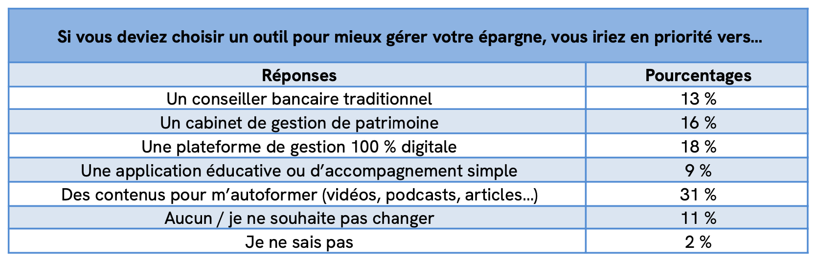 31 % plébiscitent des contenus d’autoformation (besoin de repères clairs). Et 18 % privilégient des plateformes 100 % digitales — preuve qu’une méthode guidée, simple et accessible est attendue.