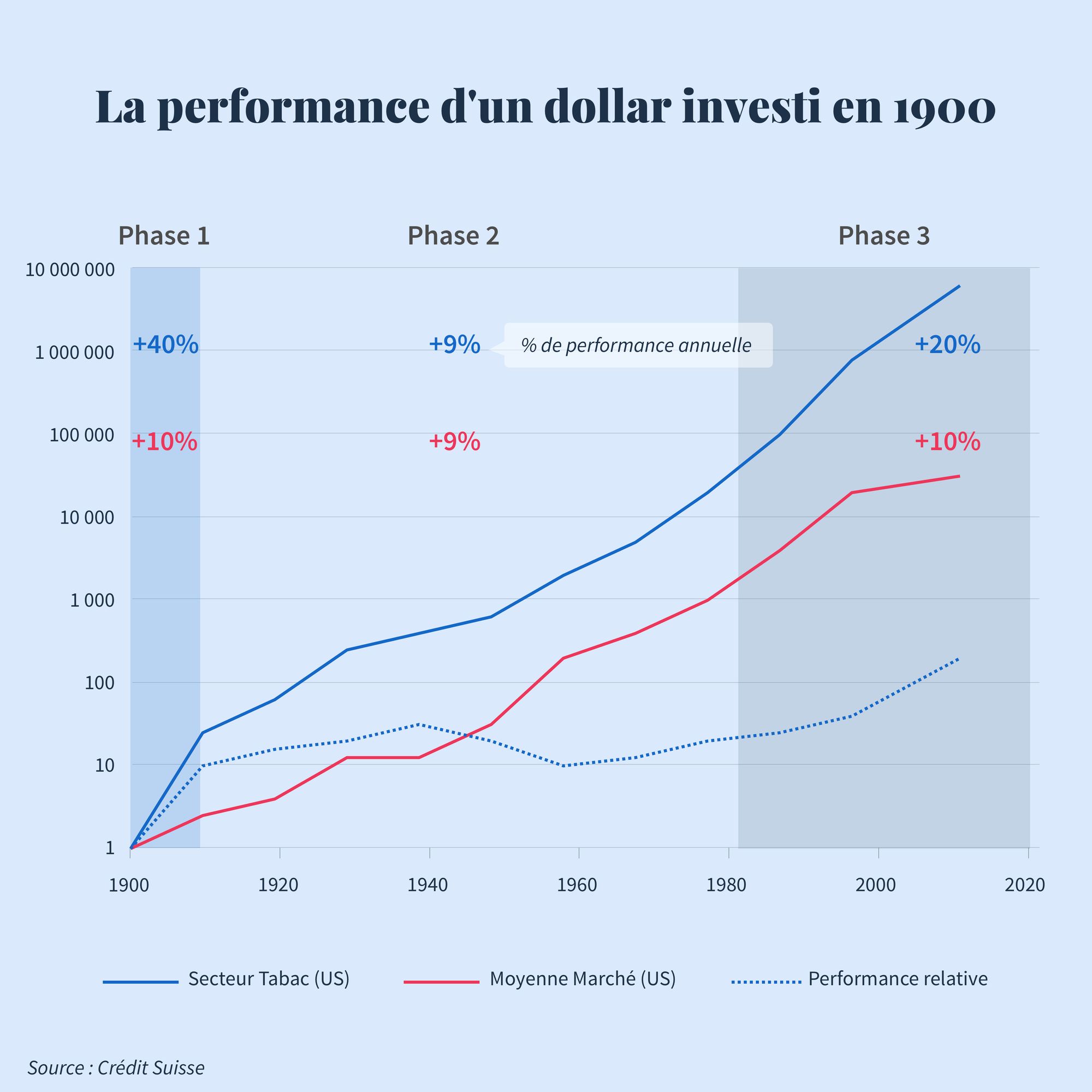 Les faits sont sans appel. Un simple dollar investi en 1900 dans les entreprises américaines qui fabriquaient des cigarettes, aurait rendu multi-millionnaires nos aïeux en 2015, c’est-à-dire en un peu plus d’un siècle ! Fort d’un pactole de 7 millions, nos aïeux auraient fait deux cent fois mieux que s’ils avaient misé la même somme sur le marché tout entier ; et cent mille fois plus que si ce dollar investi en 1900 était resté les bras croisés sur un livret d’épargne pendant 115 ans.
